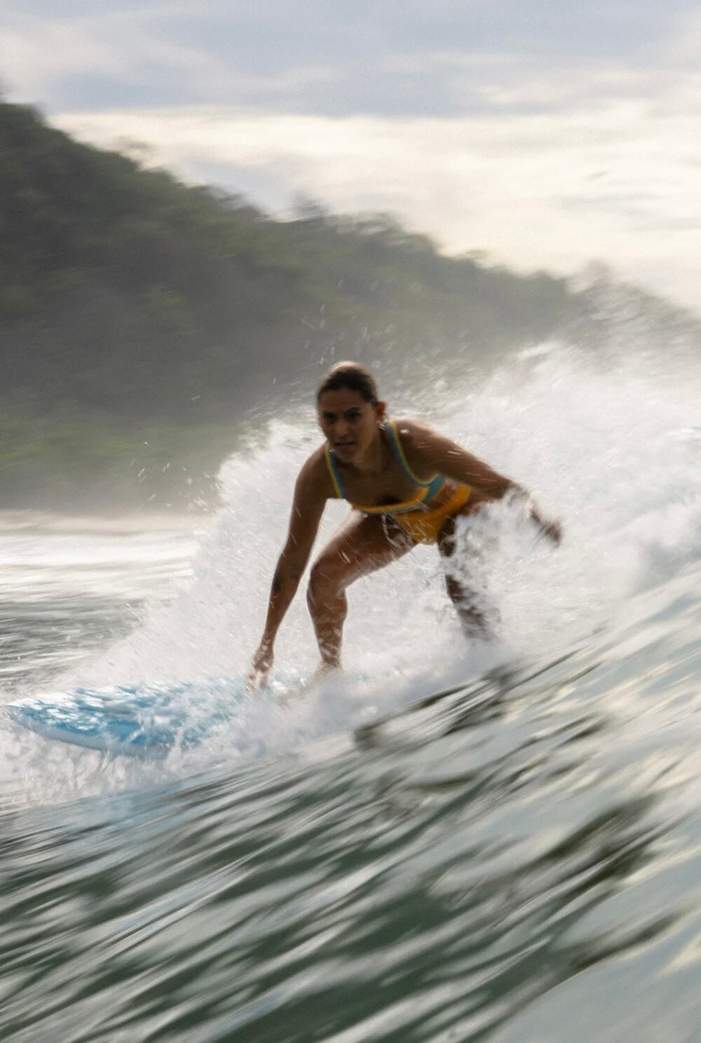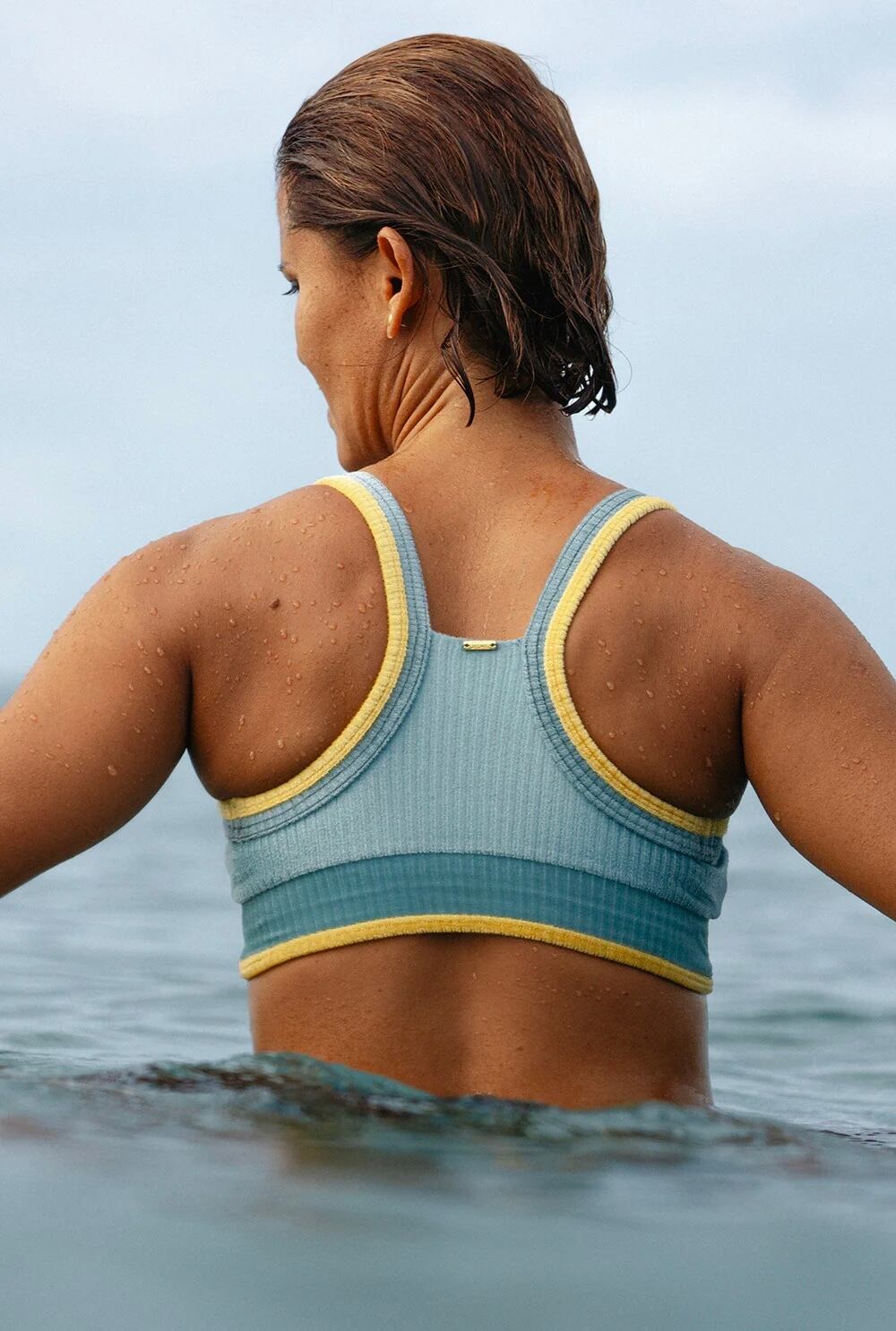スポーティトップは優れたバストサポート、取り外し可能なスポーツカップインサート、そしてお気に入りのあらゆる運動活動に最適な超ソフトなダブルライニングを備えています。ビッグウェーブサーフィン、ヨガやピラティスの練習、ジムでのトレーニングに最適なこのトップは、日光の下で様々な色調に輝く新開発のサステナブルな虹色ベルベット生地で手作りされています。