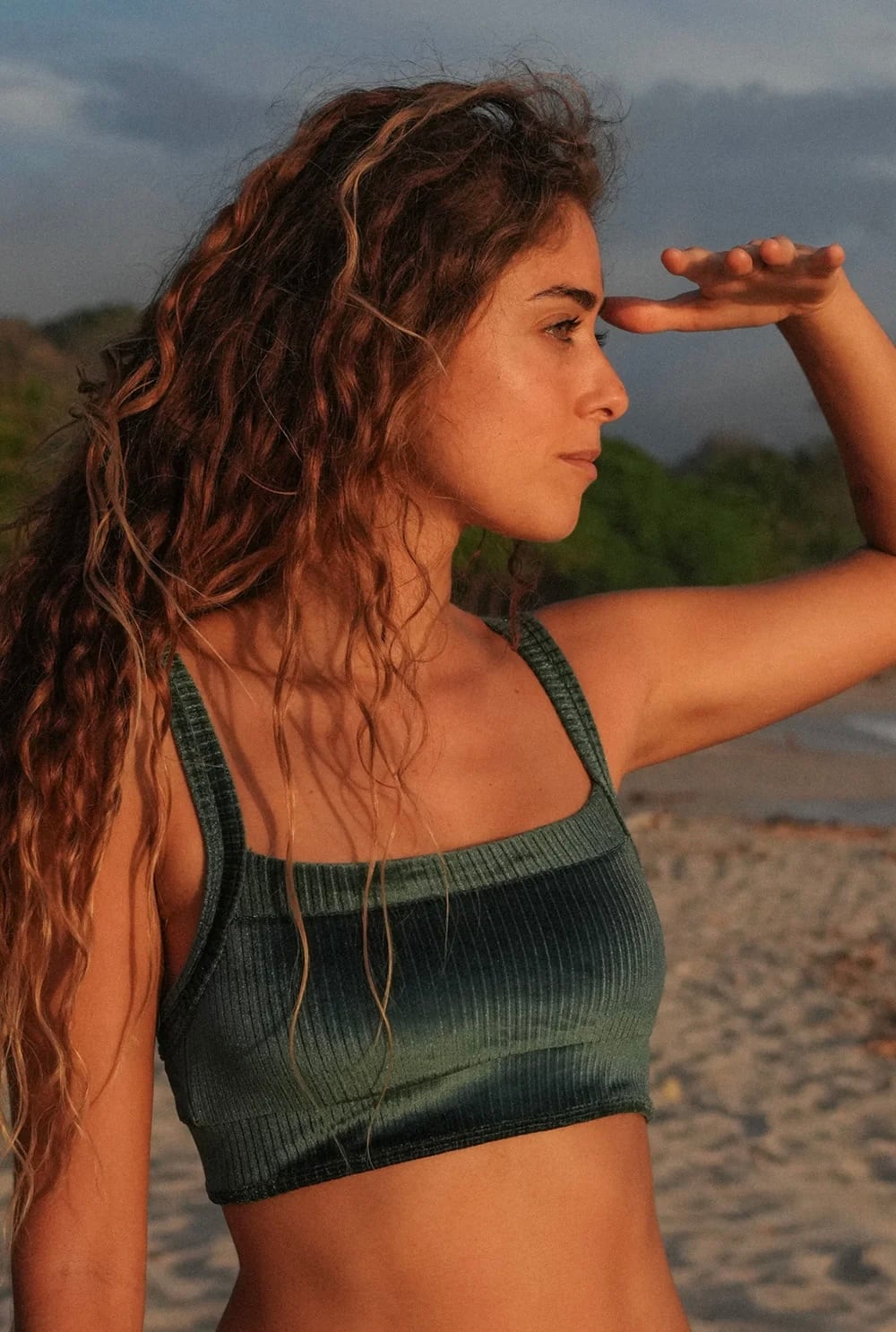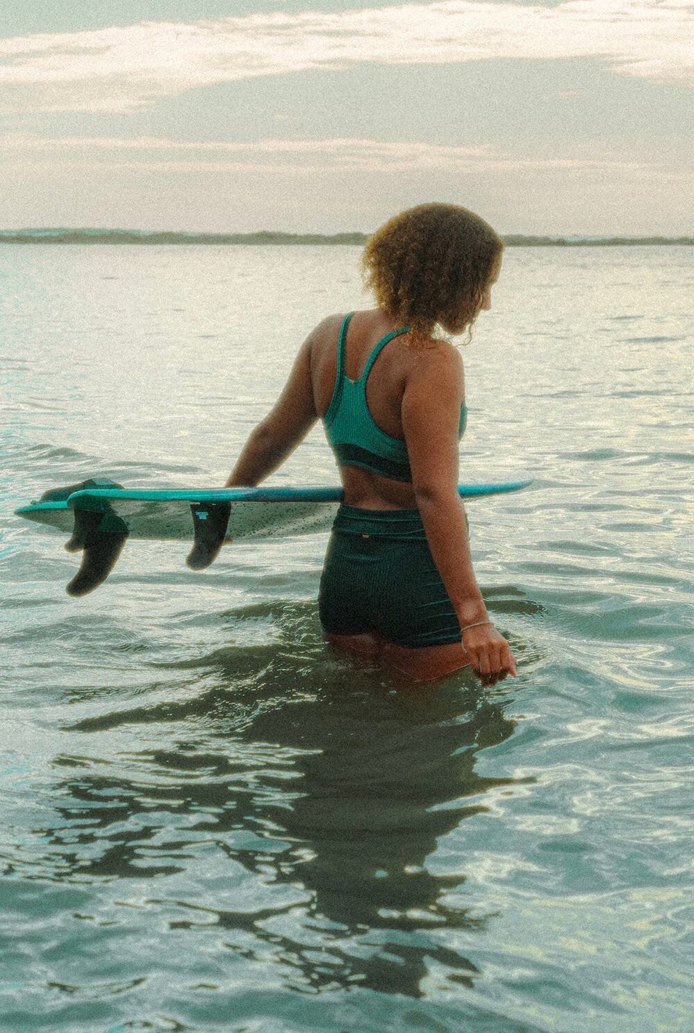 スポーティトップは優れたバストサポート、取り外し可能なスポーツカップインサート、そしてお気に入りのあらゆる運動活動に最適な超ソフトなダブルライニングを備えています。ビッグウェーブサーフィン、ヨガやピラティスの練習、ジムでのトレーニングに最適なこのトップは、日光の下で様々な色調に輝く新開発のサステナブルな虹色ベルベット生地で手作りされています。