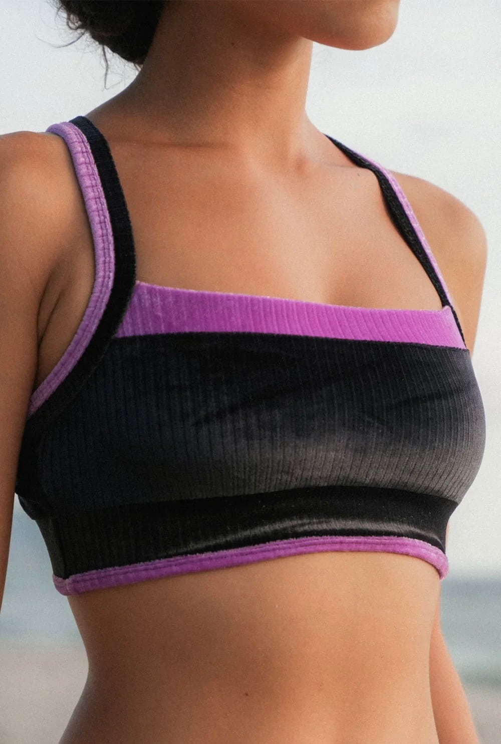 スポーティトップは優れたバストサポート、取り外し可能なスポーツカップインサート、そしてお気に入りのあらゆる運動活動に最適な超ソフトなダブルライニングを備えています。ビッグウェーブサーフィン、ヨガやピラティスの練習、ジムでのトレーニングに最適なこのトップは、日光の下で様々な色調に輝く新開発のサステナブルな虹色ベルベット生地で手作りされています。